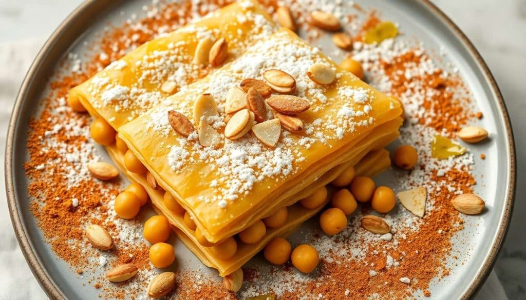 Disposez la pastilla sur un plat de présentation rond et saupoudrez généreusement de sucre glace pour un effet visuel appétissant. Servez-la découpée en parts individuelles, accompagnée de petites assiettes en céramique aux motifs orientaux pour rappeler l’origine du plat.
