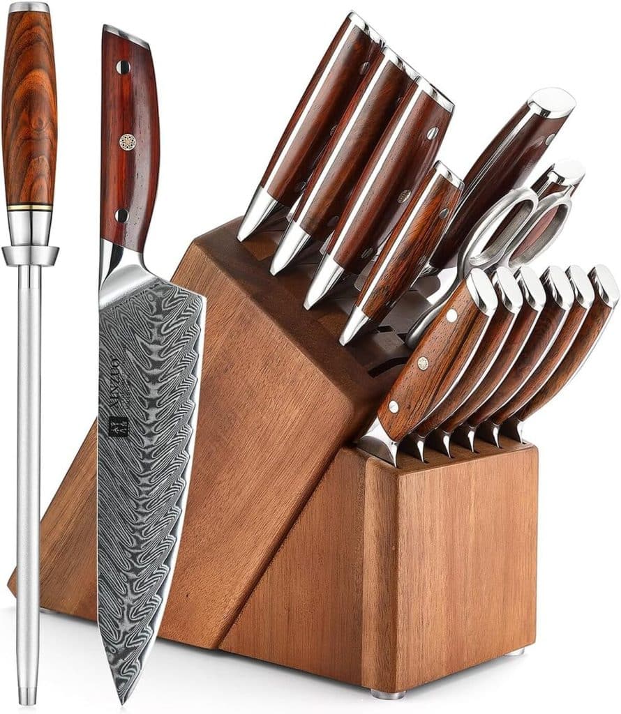 Le XINZUO Set Couteaux de Cuisine Damas 15 Pièces se distingue avant tout par sa promesse d’offrir une expérience culinaire hors du commun. Composé d’acier Damas avec 67 couches, cet ensemble s’adresse tant aux amateurs qu’aux professionnels de la cuisine. À première vue, le design est élégant et le bloc de couteaux en bois d’acacia ajoute une touche de raffinement à la cuisine. En termes de finition, le produit reçoit des louanges quasi unanimes des utilisateurs. Avec un poids total de 7 kg, le XINZUO Set semble imposant, mais bien équilibré grâce à la qualité de chaque pièce, assurant une prise en main confortable et sécurisée. Outre les couteaux, l’ensemble intègre également des ciseaux multifonctions et un fusil à aiguiser, ce qui en fait un produit polyvalent.